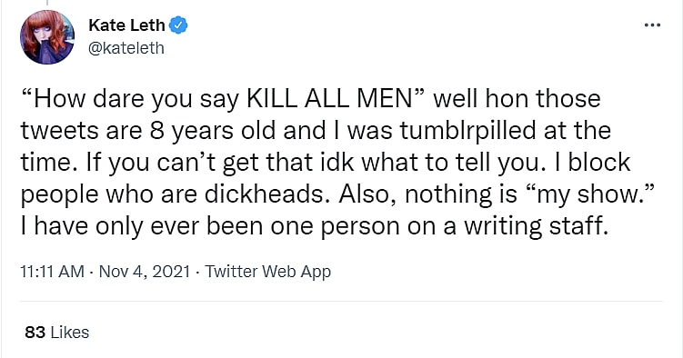 “If you can’t get that idk what to tell you,” she then dismissively told her critics. “I block people who are dickheads. Also, nothing is ‘my show.’ I have only ever been one person on a writing staff.”