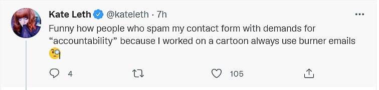Taking notice of the subsequent wave of recent backlash against her tweets, Leth took to Twitter on November 4th to observe to her followers in a now-deleted thread, “Funny how people who spam my contact form with demands for ‘accountability’ because I worked on a cartoon always use burner emails.”