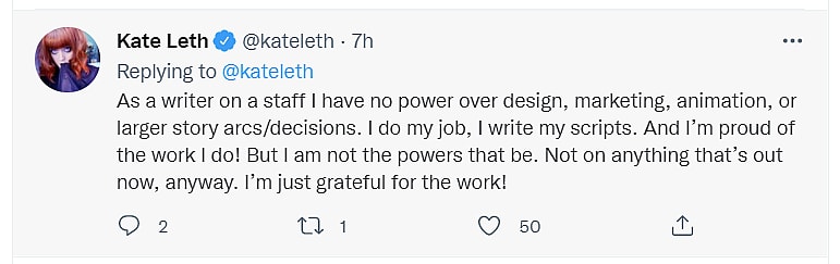 In a follow-up tweet, Leth further explained, “as a writer on a staff I have no power over design, marketing, animation, or larger story arcs/decisions. I do my job, I write my scripts. And I’m proud of the work I do!”