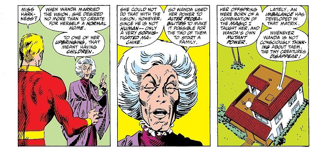 However, Harkness also acknowledges that even with Wanda’s combined powers she does not have the ability to create life and thus there is still something she does not know about Wanda’s children.
