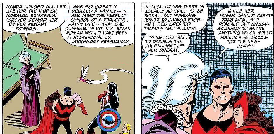 She states, Wanda longed all her life for the kind of normal existence forever denied her by her mutant powers. She so greatly desired a family — in her mind the perfect symbol of a peaceful, happy life — that she suffered what in a human would have been a hysterical or imaginary pregnancy.”