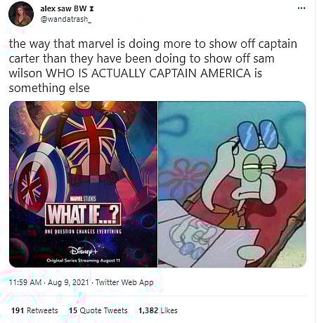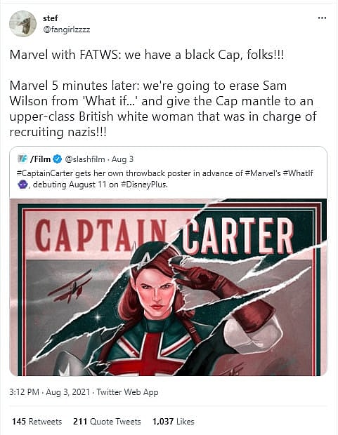 The user added, “Marvel 5 minutes later: we’re going to erase Sam Wilson from ‘What if…’ and give the Cap mantle to an upper-class British white woman that was in charge of recruiting nazis!!!”