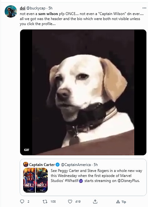 Lokisverity wrote, “look i’m excited for peggy content but NOT like this. she’s not even captain america – make a new account for captain carter and put Sam Wilson back where he belongs.”