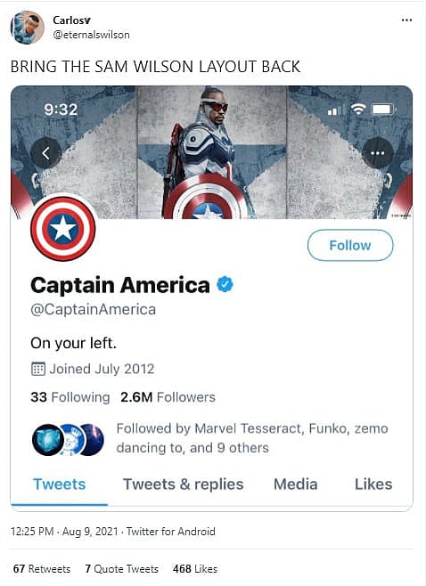 Buckycap wrote, “not even a sam wilson pfp ONCE… not even a ‘Captain Wilson’ dn ever….. all we got was the header and the bio which were both not visible unless you click the profile….”