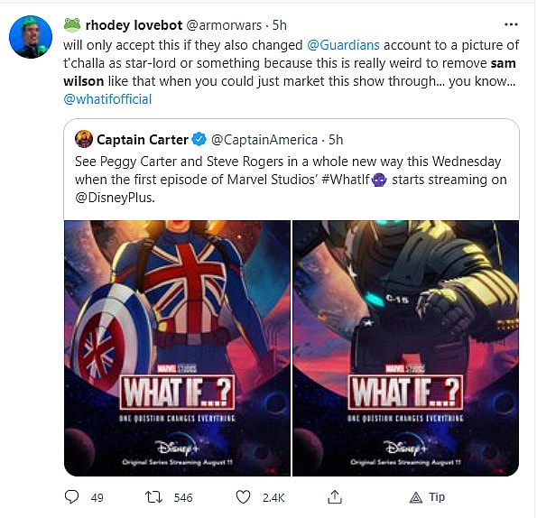 Armorwars wrote, “will only accept this if they also changed Guardians of the Galaxy’s account to a picture of t’challa as star-lord or something because this is really weird to remove sam wilson like that when you could just market this show through… you know… What If…?’s Twitter account.”