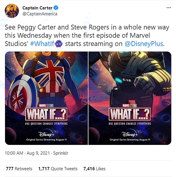 In one tweet they wrote, “See Peggy Carter and Steve Rogers in a whole new way this Wednesday when the first episode of Marvel Studios’ WhatIf starts streaming on DisneyPlus.”