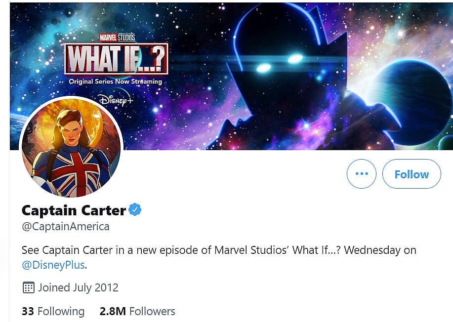 The official Captain America account recently renamed itself to Captain Carter and featured a new bio that reads, “See Captain Carter in a new episode of Marvel Studios’ What If…? Wednesday on Disney Plus.”