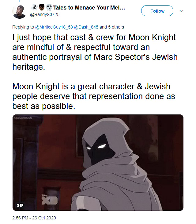 @RandyS0725 welcomed the announcement while also voicing his hope “that cast & crew for Moon Knight are mindful of & respectful toward an authentic portrayal of Marc Spector’s Jewish heritage.”