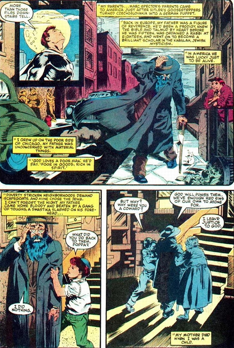 In Moon Knight #37 (1984), Spector recalls that his parents “came to America just after Hitler’s goosesteppers turned Czechoslovakia into a German puppet” during World War II, and that his father was an “ordained rabbi” who “went on to become a brilliant scholar in the Kabalah, Jewish mysticism”.