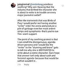 They continued, “Pointless seething? Why am I hearing that the industry that birthed the character she is about to write is in trouble on every major journalist outlet? After the trainwreck that was Birds of Prey I would prefer not having another “writer” enter the arena and produce a pile of garbage even her most ardent simps and sycophants- that’s you’re cue Tim- won’t support.”