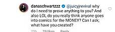 Scwhartz also replied on Instagram, “Why do I need to prove anything to you? And also LOL do you really think anyone goes into comics for the MONEY? Can I ask; what have you created?”