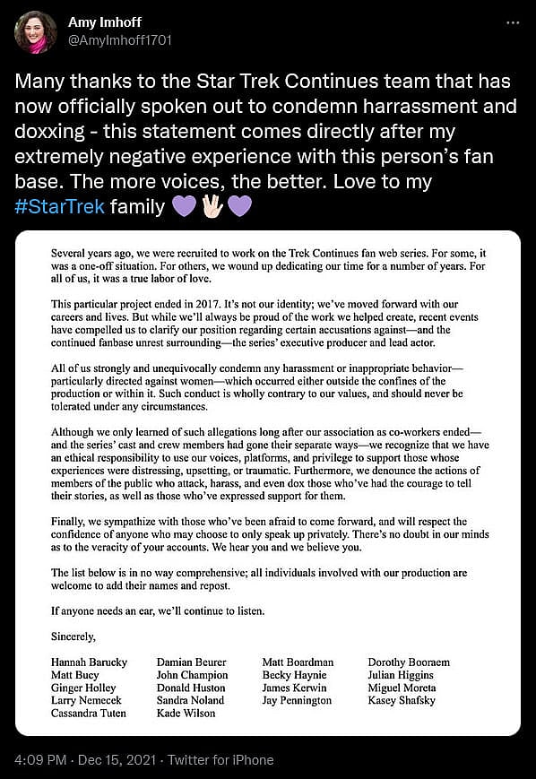 In a tweet made by Imhoff shortly after Kerwin published the group statement, the Star Trek convention host and moderator gave “many thanks to the Star Trek Continues team that has now officially spoken out to condemn harrassment and doxxing” and admitted that “ this statement comes directly after my extremely negative experience with this person’s fan base.”