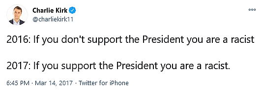 The final liked tweet came from Turning Point USA founder Charlie Kirk, and saw him compare the rhetoric of, assumedly, Democrats between the Obama and Trump presidencies, writing “2016: If you don’t support the President you are a racist. 2017: If you support the President you are a racist.”