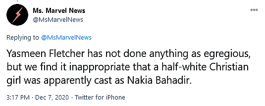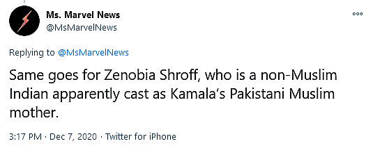 @MsMarvelNews then turned to express their dissatisfaction with the race of two alleged cast members, Yasmeen Fletcher and Zenobia Shroff.