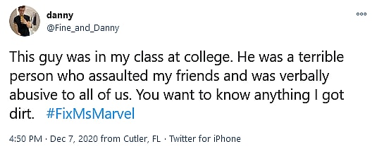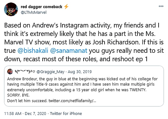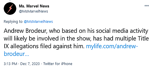 While the @MsMarvelnews account provided a link to background check information aggregator MyLife and claimed that it held proof of Brodeur’s Title IX accusations, this information is locked behind a paywall on the website and is unable to be verified by Bounding Into Comics at this time.