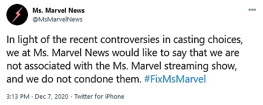 The backlash against the upcoming Marvel series began on December 7th, when Ms. Marvel fan-account @MsMarvelNews announced to their followers that “In light of the recent controversies in casting choices, we at Ms. Marvel News would like to say that we are not associated with the Ms. Marvel streaming show, and we do not condone them.”
