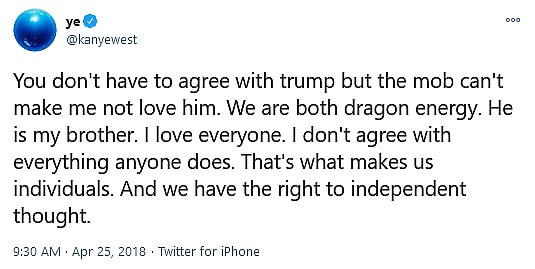 The next was West’s infamous ‘dragon energy’ tweet in which, the rapper and former-presidential candidate shared his opinion that “you don’t have to agree with trump but the mob can’t make me not love him.”