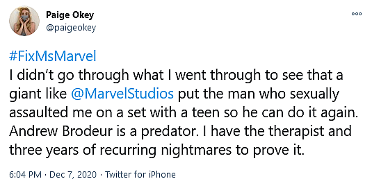 @PaigeOkey claimed that she had been one of his victims, declaring that she “didn’t go through what I went through to see that a giant like @MarvelStudios put the man who sexually assaulted me on a set with a teen so he can do it again.”