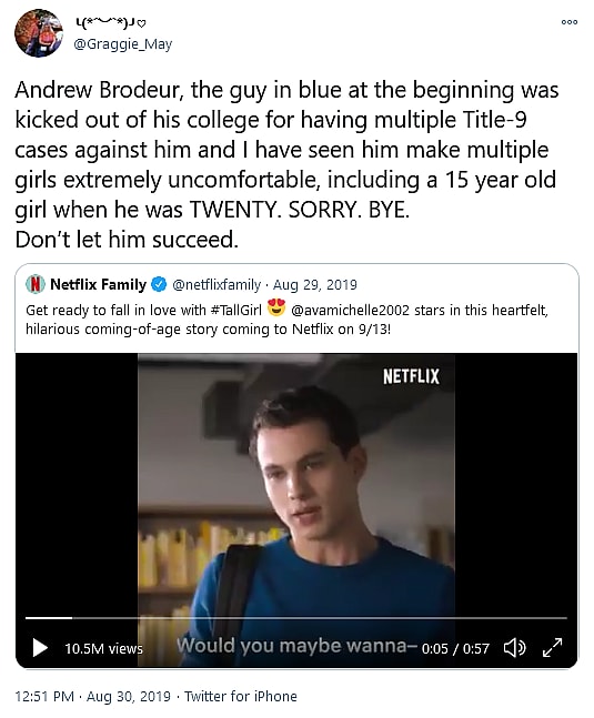 According to a 2019 tweet from @Graggie_May, Brodeur “was kicked out of his college for having multiple Title-9 cases against him and I have seen him make multiple girls extremely uncomfortable, including a 15 year old girl when he was TWENTY.”