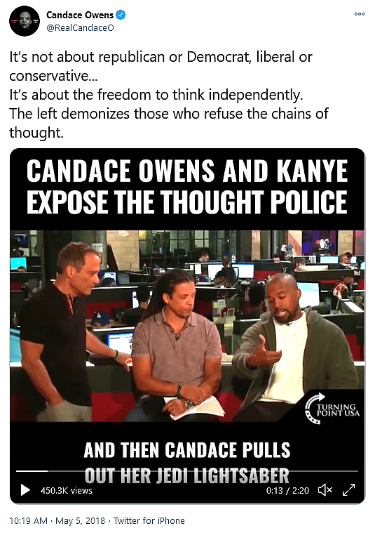 The first was from conservative commentator Candace Owens, who shared a video of herself and Kanye West being interviewed by TMZ and wrote “It’s not about republican or Democrat, liberal or conservative…It’s about the freedom to think independently.”