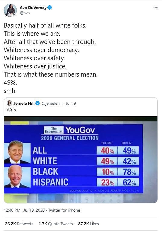 In July 2020, DuVernay would further show off her racism responding to a poll showing President Donald Trump was receiving 49% support from white people.