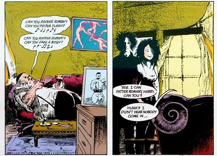 The scene is derived from an incident in the Vertigo Comic and it plays out nearly the same as on the page with a few exceptions. Aside from how different Death looks, Harry has facial hair and a yarmulke in the issue. He also lays on a couch in a dingy apartment as opposed to the chair and condo-like confines in the clip.
