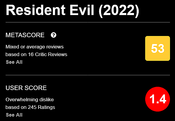 Likewise, sister review aggregator Metacritic holds a collective 53/100 from critics and a 1.4/10 from average viewers – the latter generated from a ratio of 26 positive reviews, 5 mixed, and 214 negative – for the Umbrella-level abomination.