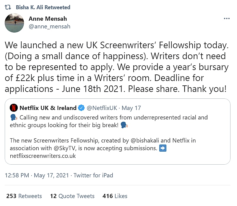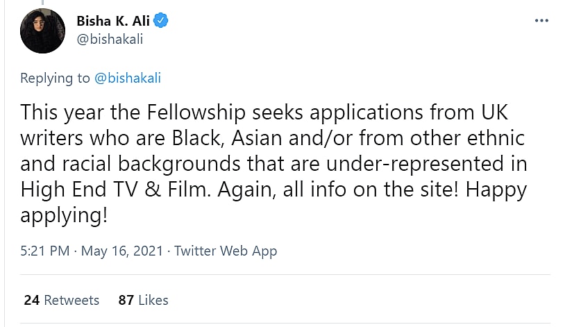 Ali would echo that on Twitter. She wrote, “This year the Fellowship seeks applications from UK writers who are Black, Asian and/or from other ethnic and racial backgrounds that are under-represented in High End TV & Film.”