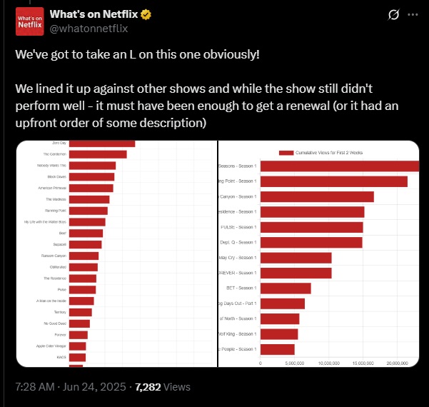 Following up on their original read of the situation via their official Twitter account, What’s on Netflix later acknowledged their own bewilderment towards the news, admitting “We’ve got to take an L on this one obviously. We lined it up against other shows and while the show still didn’t perform well – it must have been enough to get a renewal (or it had an upfront order of some description).”