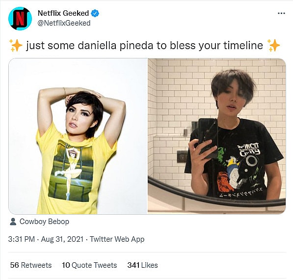 In response to this backlash, Netflix tweeted two photos of Daniella Pineda wearing Cowboy Bebop t-shirts with the first one showing Faye Valentine in her iconic outfit from the anime.