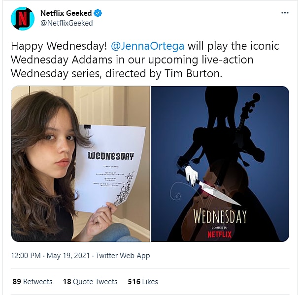 Netflix tweeted, “Happy Wednesday! Jenna Ortega will play the iconic Wednesday Addams in our upcoming live-action Wednesday series, directed by Tim Burton.”