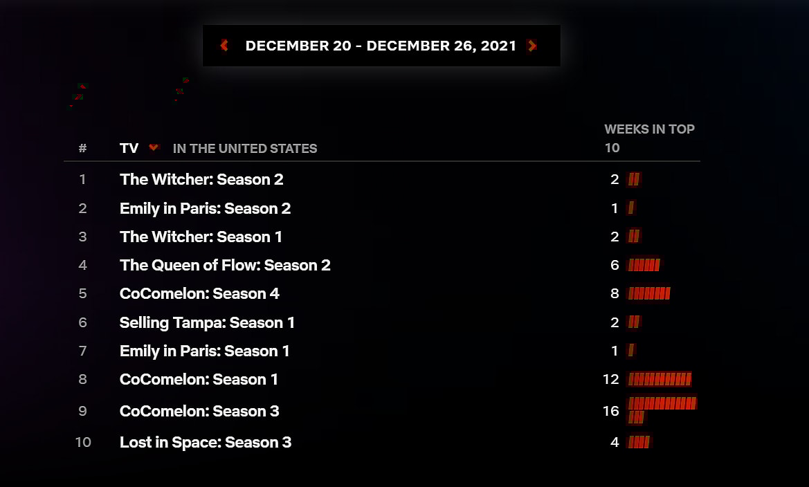 The rest of the top 10 included The Queen of Flow: Season 2, CoComelon: Season 4, Selling Tampa: Season 1, Emily in Paris: Season 1, CoComelon: Season 1, CoComelon: Season 3, and Lost in Space: Season 3.