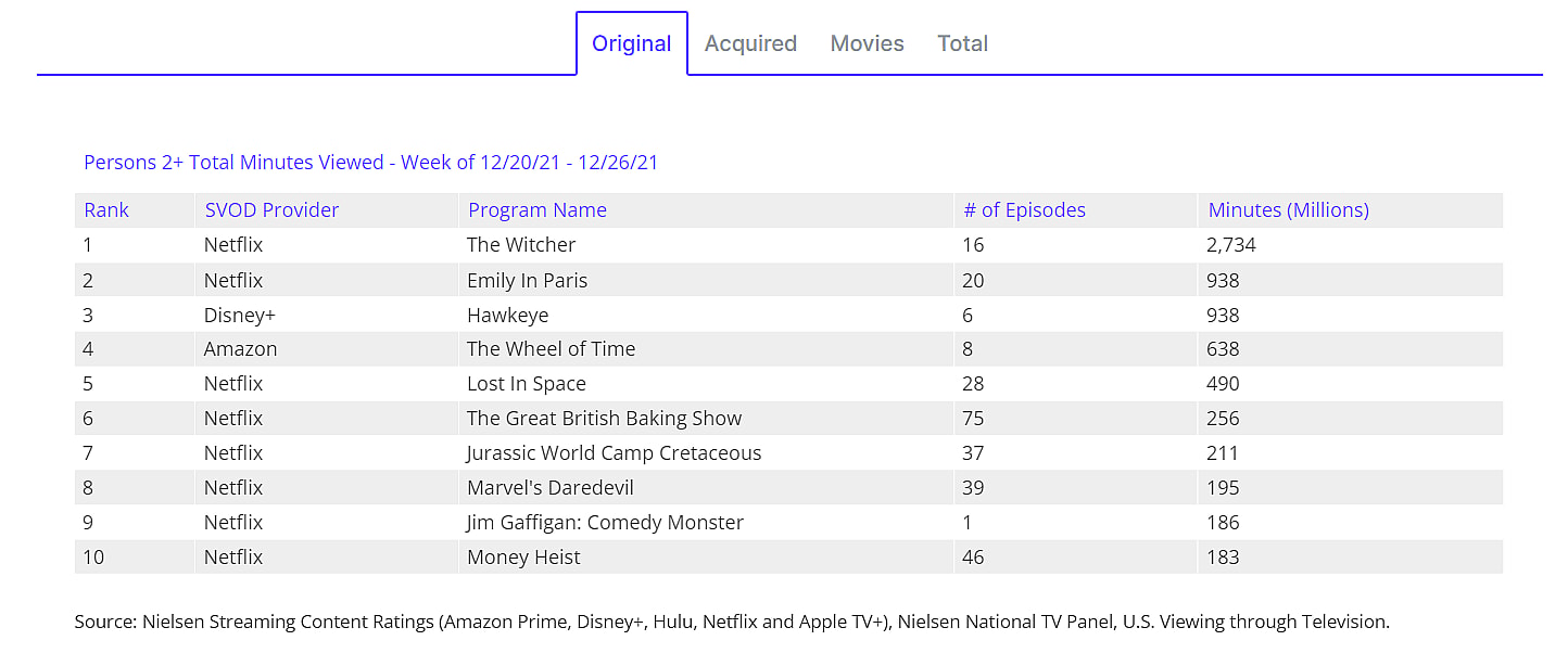 As for the discrepancy between Nielsen’s data and Netflix’s, CoComelon is not considered a Netflix original by Nielsen, and tracks that show’s numbers under their “Acquired” tab.