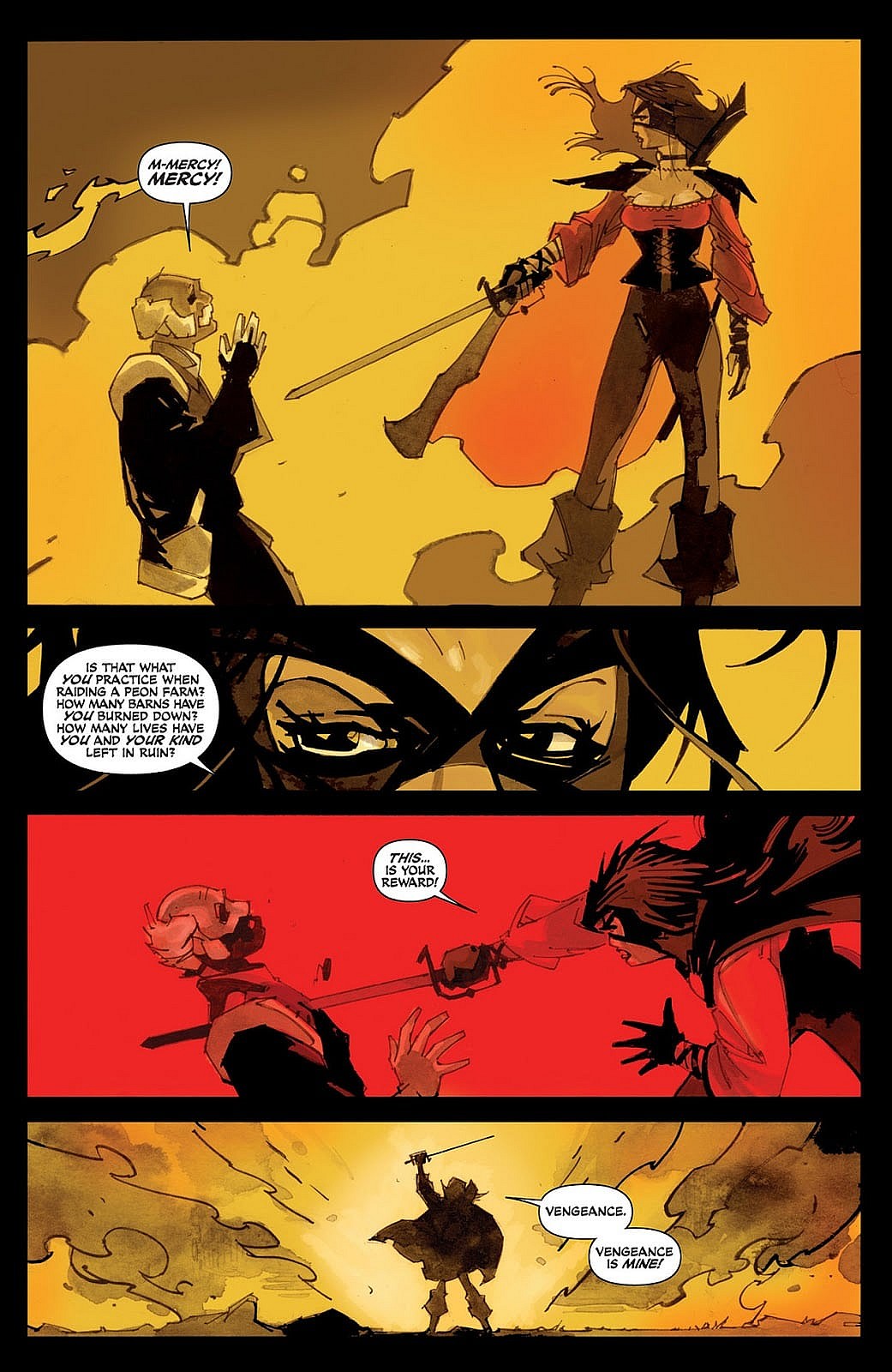 The character impersonates Zorro and perverts his cause for her own desire for vengeance.