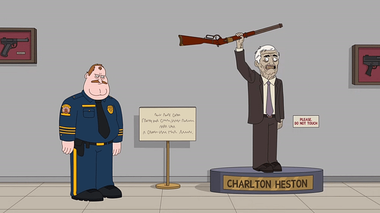 Also on display at the NRA headquarters in “Trigger Warning” is a gun pit in which a dead child is found buried underneath a collection of firearms next to the corpse of Charlton Heston, whose corpse bears a sign reading “Pry this gun from my cold, dead hands and win a Republican Senate seat,” a sarcastic take on the late actor’s famous quote made in defense of gun rights.