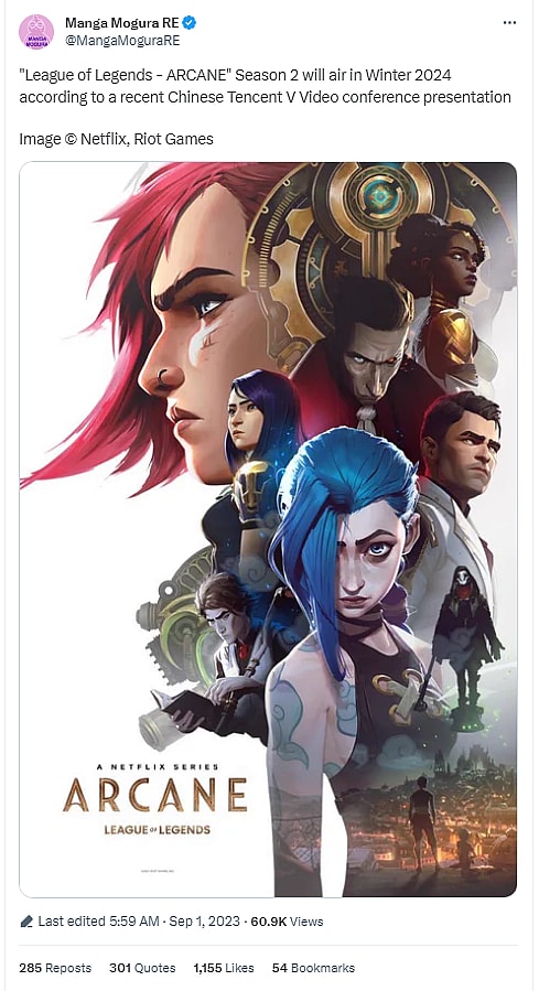 The account specifically wrote, “‘League of Legends – ARCANE’ Season 2 will air in Winter 2024 according to a recent Chinese Tencent V Video conference presentation.”