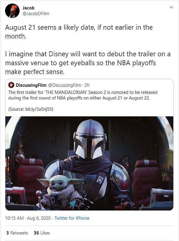 LRM Online’s Shockey writes, “According to our source the trailer for the second season of The Mandalorian will drop during the first round of the NBA playoffs. The date that they are looking at is either August 21st or August 22nd.”
