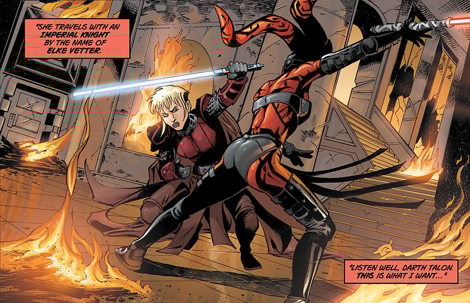 While on Soccorro, Talon faces off against the Imperial Knight Elke Vetter and viciously tortures her to gain information on Marasiah Fel.
