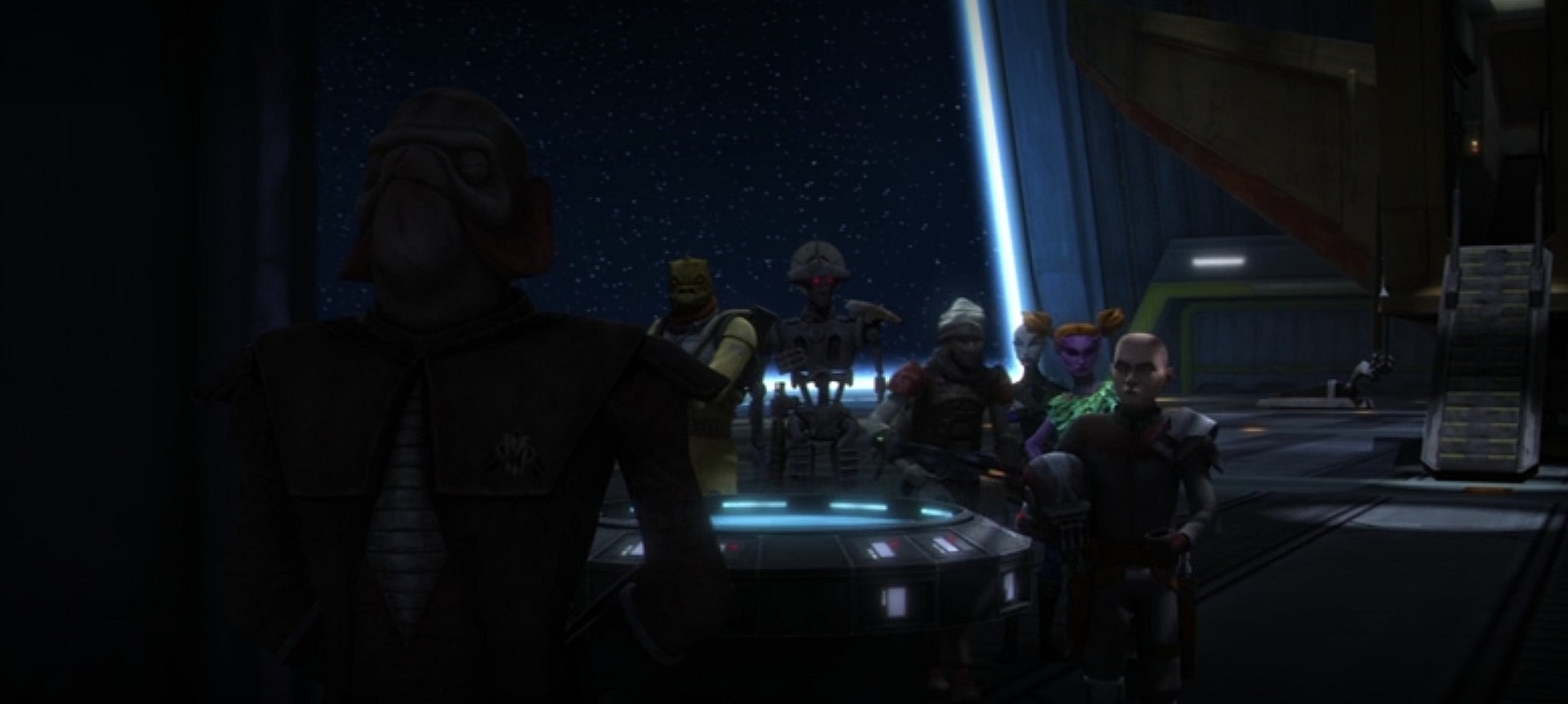 The bounty hunter Embo is also seen in the “Bounty,” but he’s not part of Fett’s team. He’s shown leaving the Fett’s base of operations just before Ventress, Bossk, and Latts Razzi entered.