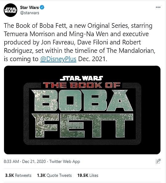 The official Star Wars Twitter account noted, “The Book of Boba Fett, a new Original Series, starring Temuera Morrison and Ming-Na Wen and executive produced by Jon Favreau, Dave Filoni, and Robert Rodriguez, set within the timeline of The Mandalorian, is coming to Disney Plus Dec. 2021.”