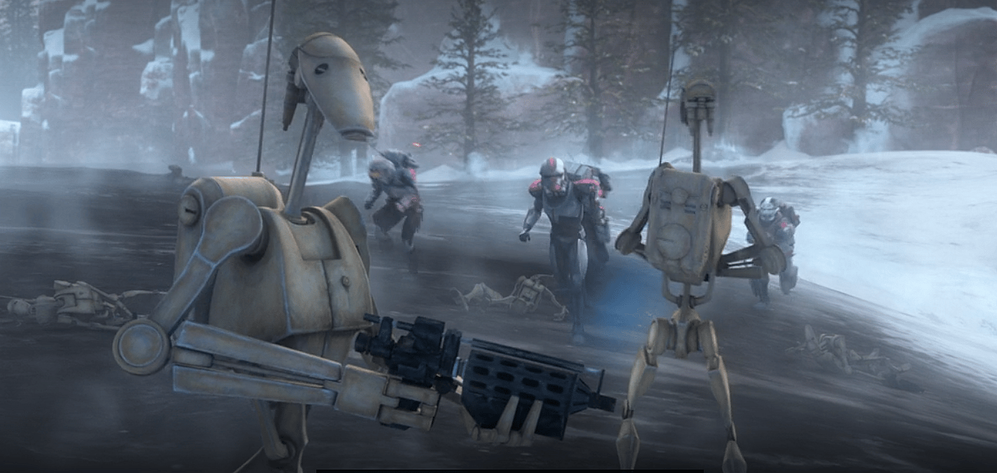 He shows up with the Bad Batch aka Clone Force 99, who steam roll a bunch of droids while Billaba and Dume’s forces sit and watch them.
