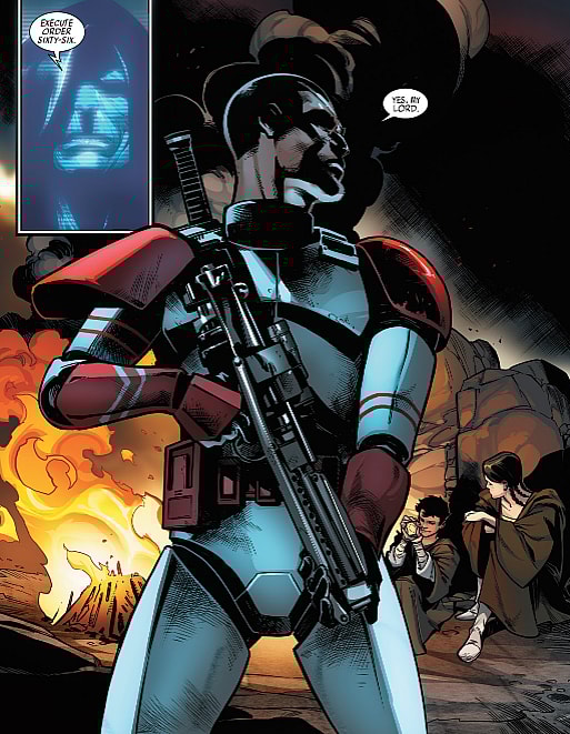 While fleeing, Dume runs back into the Bad Batch. He tells them to stay away and heads into a forest area. The Bad Batch members Hunter and Crosshair pursue him.