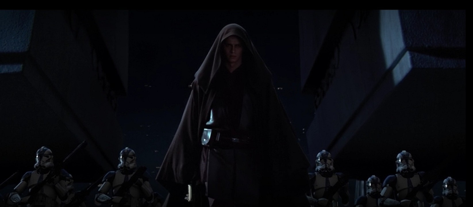 A little after halfway through the film, Anakin disobeys Mace Windu’s orders and arrives at the Senate and chooses to chop off Windu’s arm due to his own selfishness and greed stemming from his desire to want to protect Padme from the death he sees in his visions.