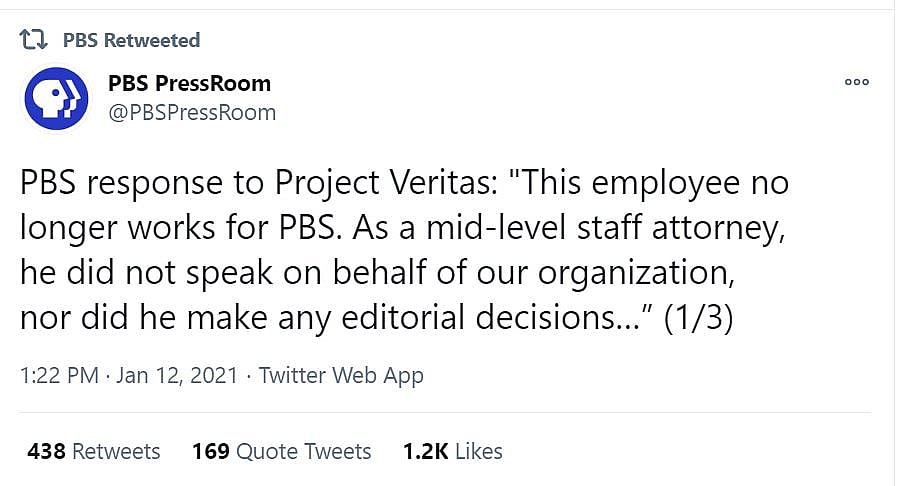They wrote, “This employee no longer works for PBS. As a mid-level staff attorney, he did not speak on behalf of our organization, nor did he make any editorial decisions.”