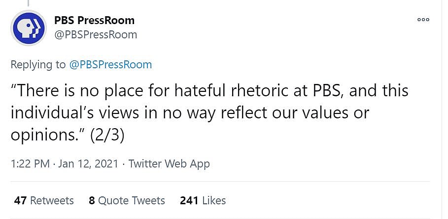 “There is no place for hateful rhetoric at PBS, and this individual’s views in no way reflect our values or opinions,” they added.