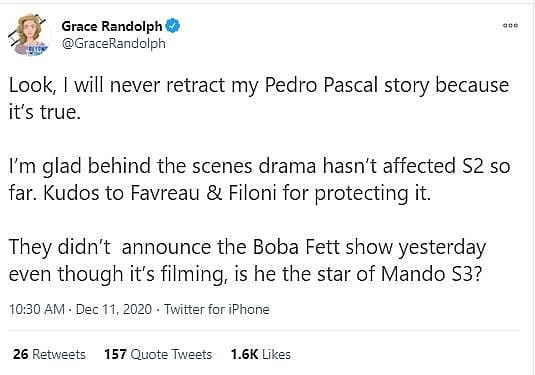 She wrote, “Look, I will never retract my Pedro Pascal story because it’s true. I’m glad behind the scenes drama hasn’t affected S2 so far. Kudos to Favreau & Filoni for protecting.”