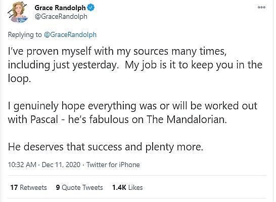 However, it came after Randolph defended herself on Twitter for a previous scoop claiming there was drama behind the scenes on The Mandalorian and that Pascal had left the show halfway through production on Season 2.