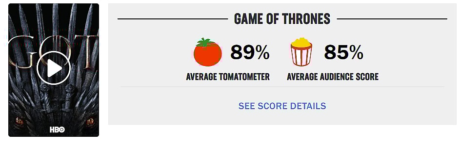 On Rotten Tomatoes, Game of Thrones has an overall average audience score of 85%.