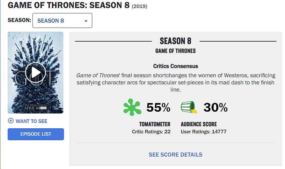 However, Season 8 had an abysmal 30% audience score from 14,777 user ratings.