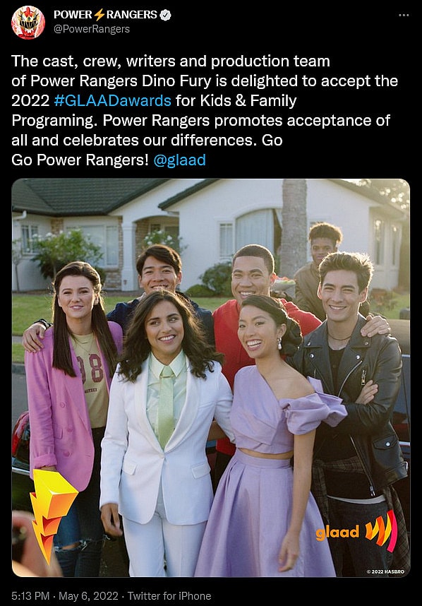 Receiving the award during a May 6th New York ceremony for GLAAD’s 33rd annual Media Awards – a previous ceremony was held in Los Angeles on April 2nd – the Nickelodeon (season one) and Netflix (season two)-produced Western counterpart to Japan’s Kishiryu Sentai Ryusoulger announced their win on Twitter, tweeting from the official series account, “The cast, crew, writers and production team of Power Rangers Dino Fury is delighted to accept the 2022 #GLAADawards for Kids & Family Programing.”